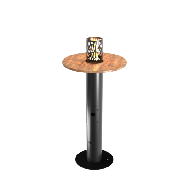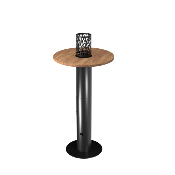 FUENTE I Gas-Terrassenheizung und Stehtisch mit Thermoelementsensor. Ausgestattet mit einer runden Holzplatte mit Kamin. Er kann als hoher Stütztisch dienen. Angetrieben durch eine Flasche – eine Mischung aus Propan- und Butangasen oder reines Propangas. Mit einer 11-kg-Flasche Dauerbetrieb bis zu 196 Stunden (8 Tage). Manuell und Fernbedienung mit einer Fernbedienung.